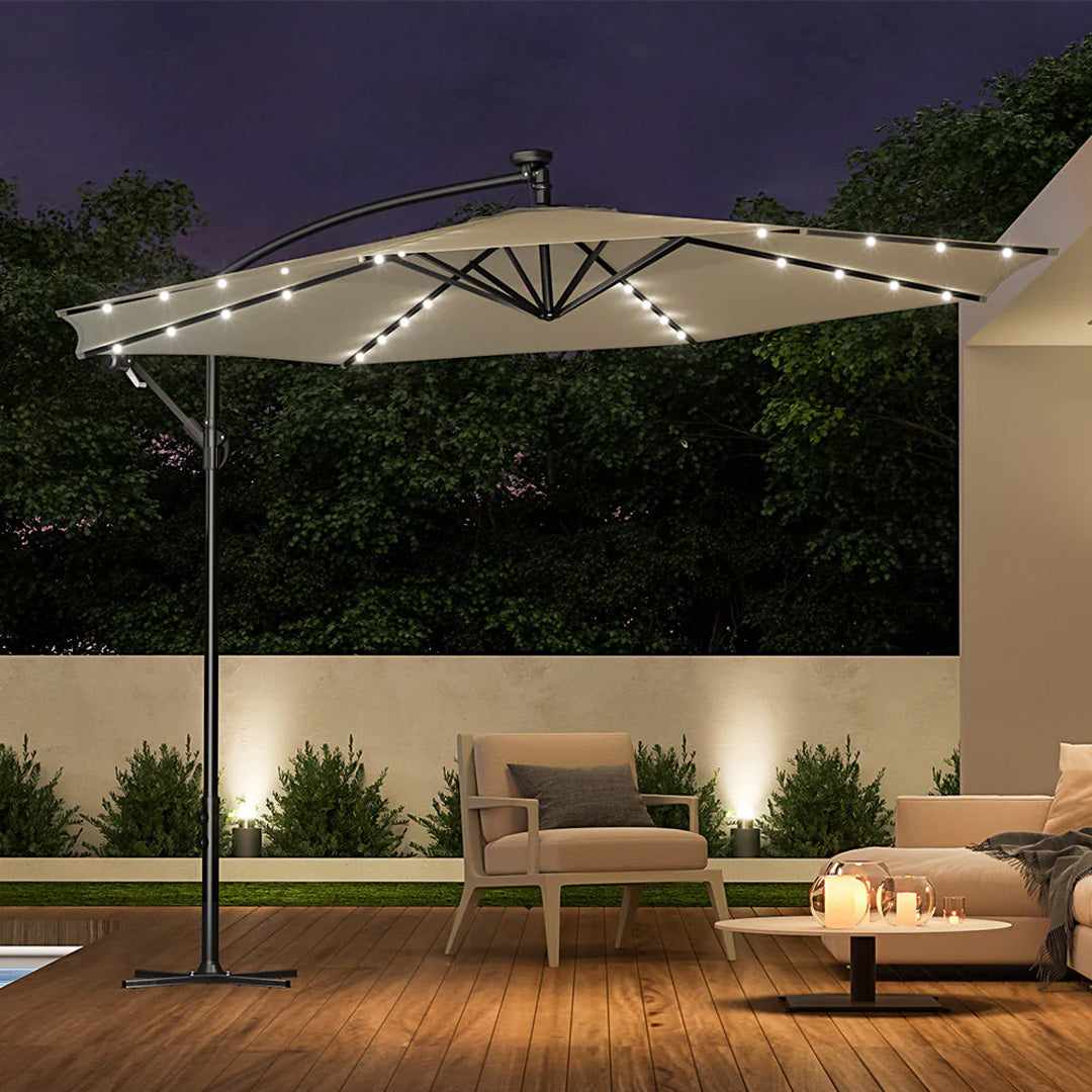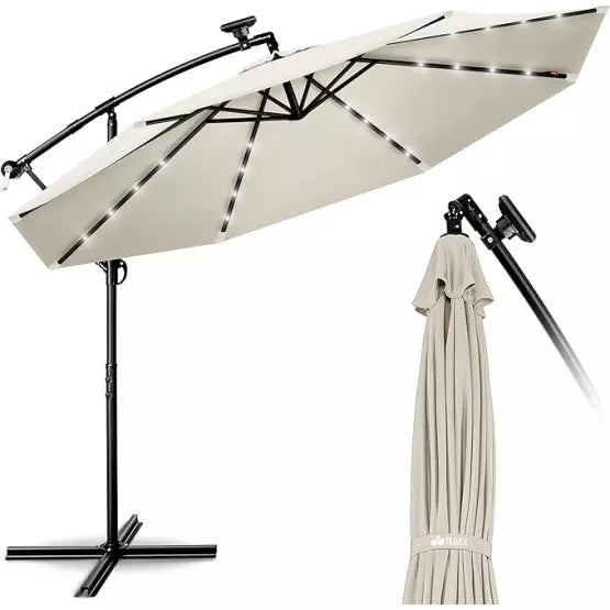 • Градински чадър с LED светлини: Осигурява романтична и приятна осветеност, перфектна за нощни събирания. LED светлините са проектирани да светят 6-7 часа.