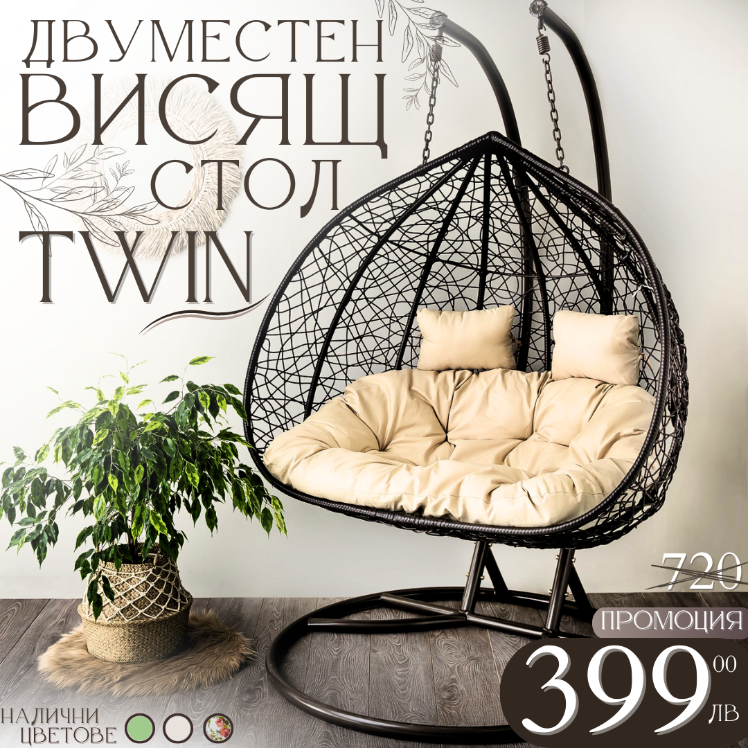 Широк висящ стол пашкул Мечтаете ли за необикновен оазис на спокойствието, който съчетава стил и комфорт? Висящият стол Twin е перфектен избор за градината, терасата или верандата, както и като стилен декоративен елемент за интериора. Нейната удължена седална възглавница предлага комфорт, докато покритието от полиратан гарантира здравина и устойчивост на неблагоприятни атмосферни условия. Полиратанът, материал, подобен на естествения ратан, но значително по-издръжлив, обещава на фотьойла Twin дълги години употреба без притеснение от повреда или избледняване. Освен това, седалката с пружинно окачване на коша с регулиране на височината позволява тя да бъде съобразена с индивидуалните нужди, докато формованата рамка осигурява стабилност и безопасност.