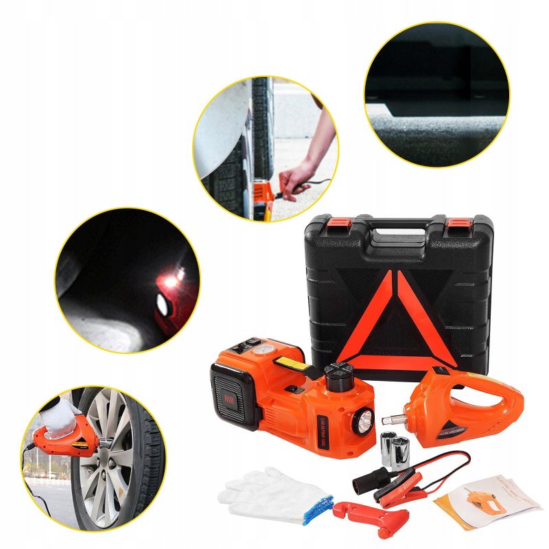 Електрически авариен комплект за автомобили включва крик, компресор, ударен гайковерт и аварийно чукче. Крикът е с максималана товароносимост 5 т и височина на повдигане 115-450 мм. Оборудван е с LED осветление. Максималният въртящ монент на гайковертa е 340 Nm. Дължината на захранващия кабел е 3.5 м. Комплектът се доставя в удобен куфар за съхранение и пренасяне.