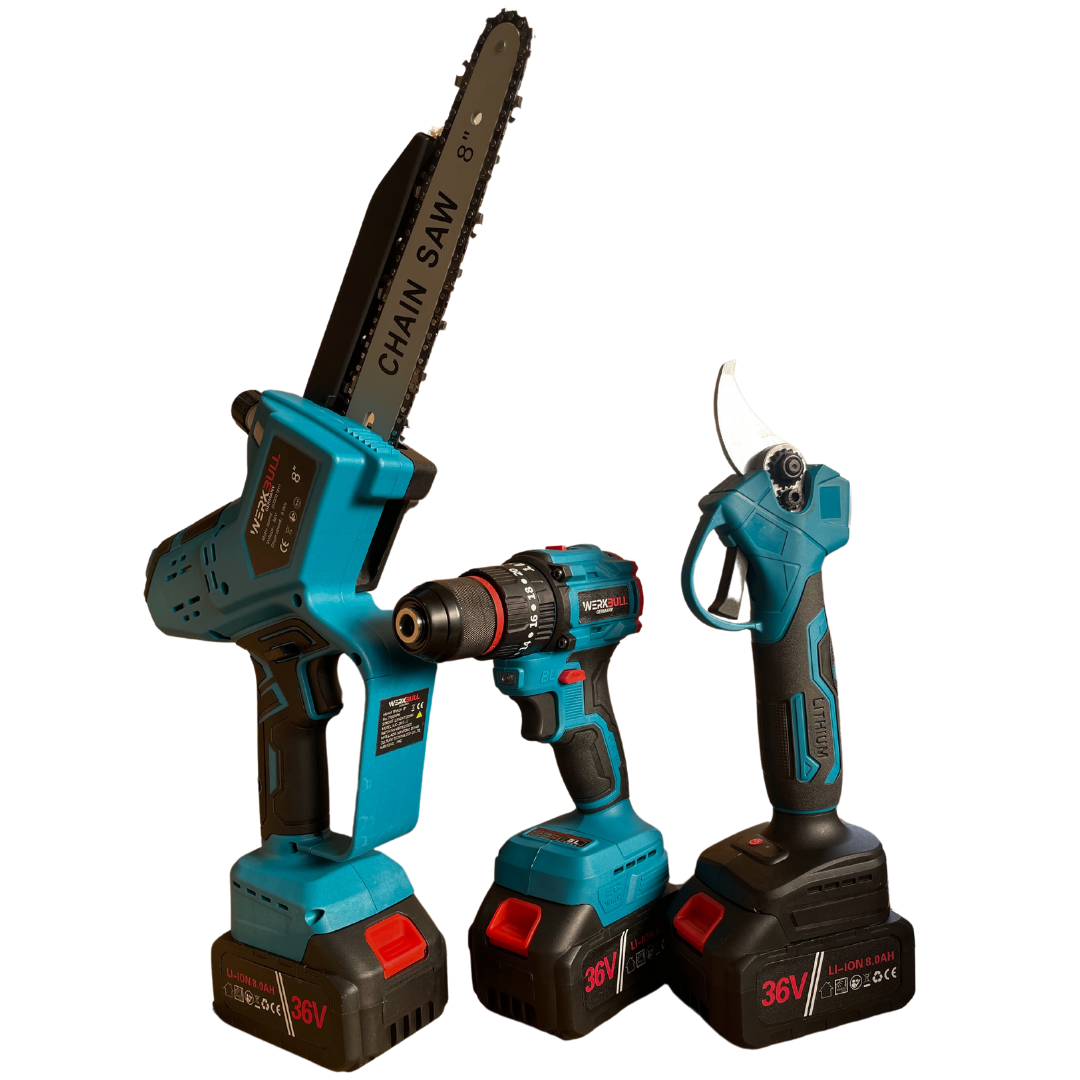 Комплект 3 в 1: Акумулаторен Винтоверт, Лозарска Ножица и Акумулаторна Резачка WerkBull 36V 8.0Ah