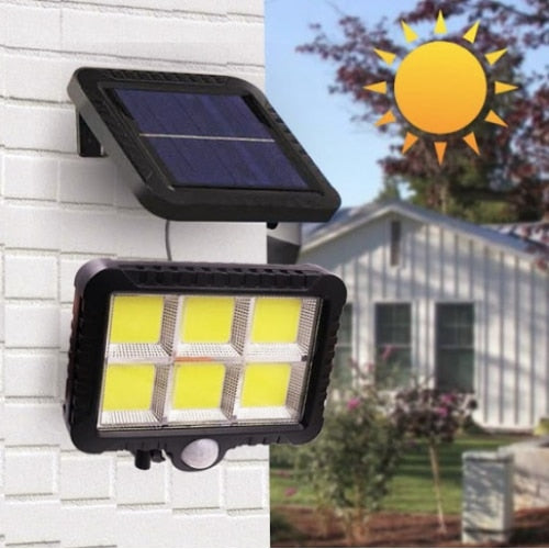Мощна соларна LED лампа със 120 COB диода и сензор за движение. С отделен соларен панел и кабел 5 метра. С отделния соларен панел и кабел, тази лампа е изключително подходяща за монтиране на места където няма пряка слънчева светлина. Самата лампа може да се използва и в закрити не осветени помещения. Подходяща за монтиране под козирка.