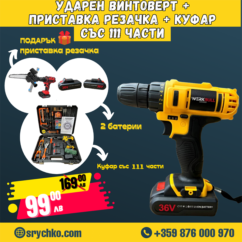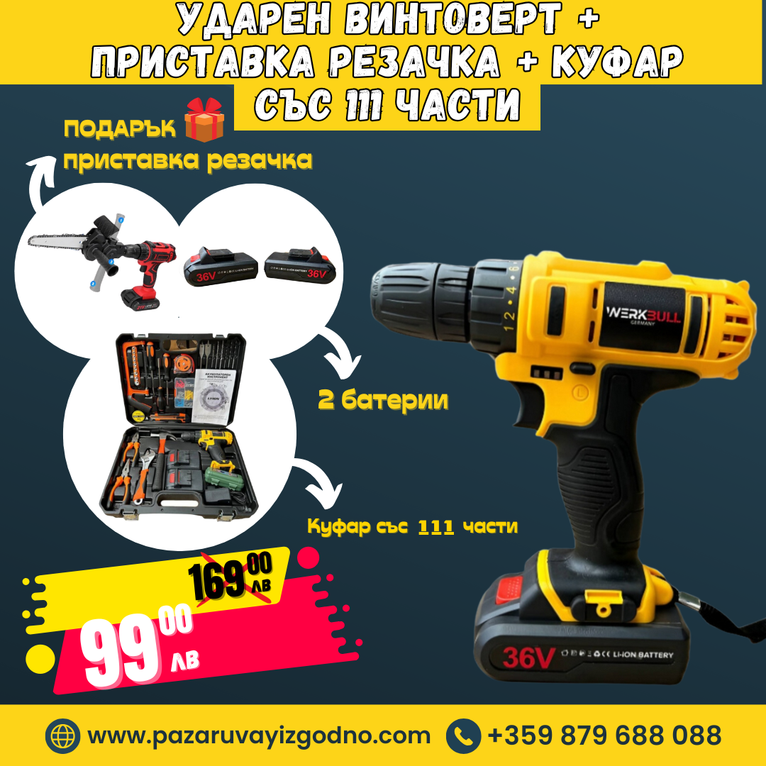 Немски Ударен Винтоверт WerkBull 111ч с две батерии 8Ah + Подарък Верижен трион