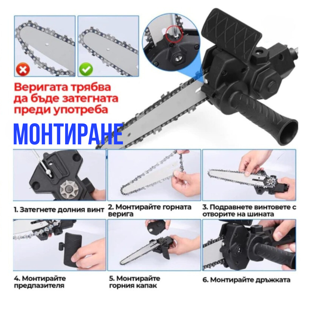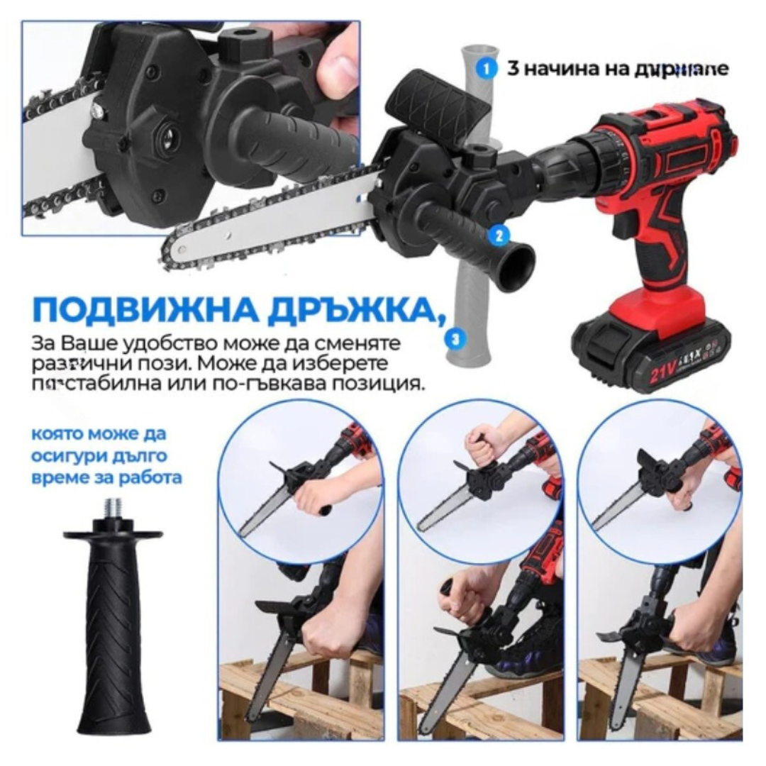 Новият продукт 2024г улеснява работата и спестява време, пари и нерви. Универсална Приставка за Винтоверт WerkBull е инструмент, който позволява да използвате вашия винтоверт и като резачка. Това ви позволява да превключвате за секунди между винтоверт и резачка. В комплекта е включен и предпазител, който влиза в полза на собственика, когато режете дървени греди или клони. Верижният трион с лекота може да отреже клон с диаметър 10см. С този преобразувател с 18см шина дори не е необходимо да купувате верижен трион, спестявайки пари и време. В сравнение с традиционните тежки електрически верижни триони, този моторен