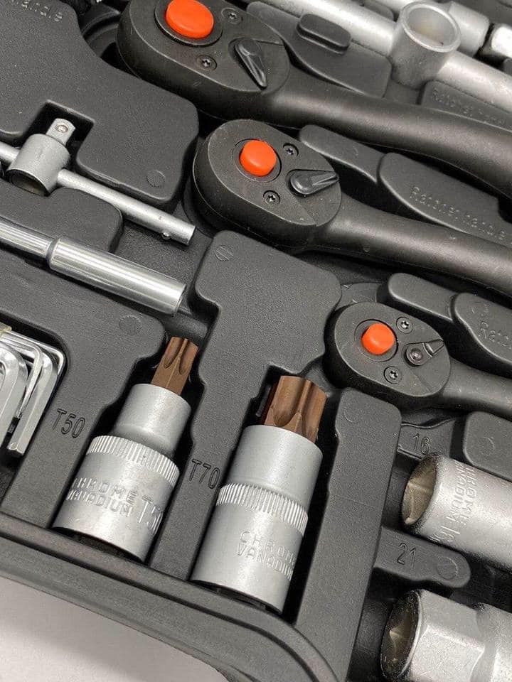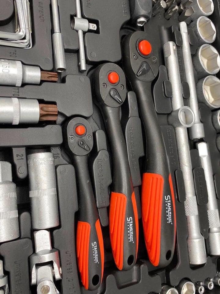 Качествен немски комплект от инструменти с усилени тресчотки,включващ всичко необходимо. Изработени от качествена хром-ванадиева стомана. Удобен за съхранение куфар, в който всичко ще седи на мястото си.
