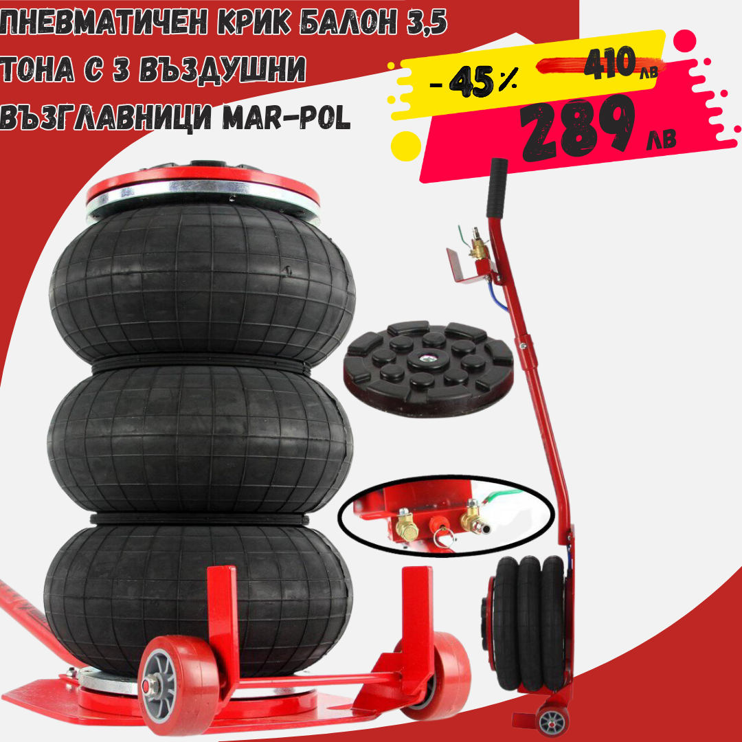ПНЕВМАТИЧЕН КРИК БАЛОН 3,5 ТОНА С ПРИСТАВКА И 3 ВЪЗДУШНИ ВЪЗГЛАВНИЦИ MAR-POL