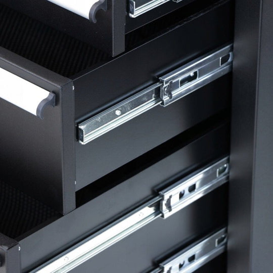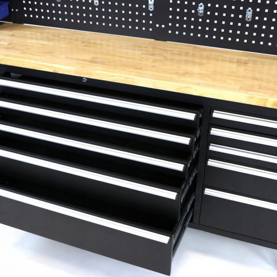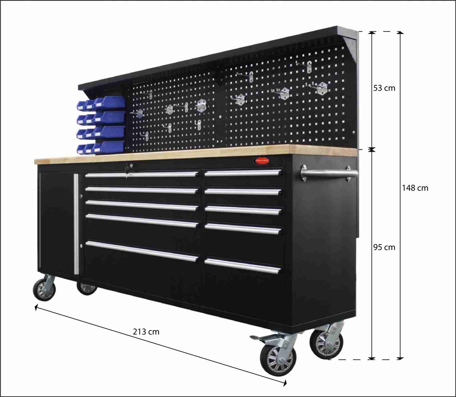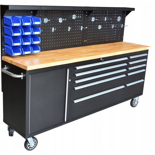 Количката разполага с шкаф и 10 чекмеджета (празни) , различни по размер. Има и удобен работен плот и място за закачкали за