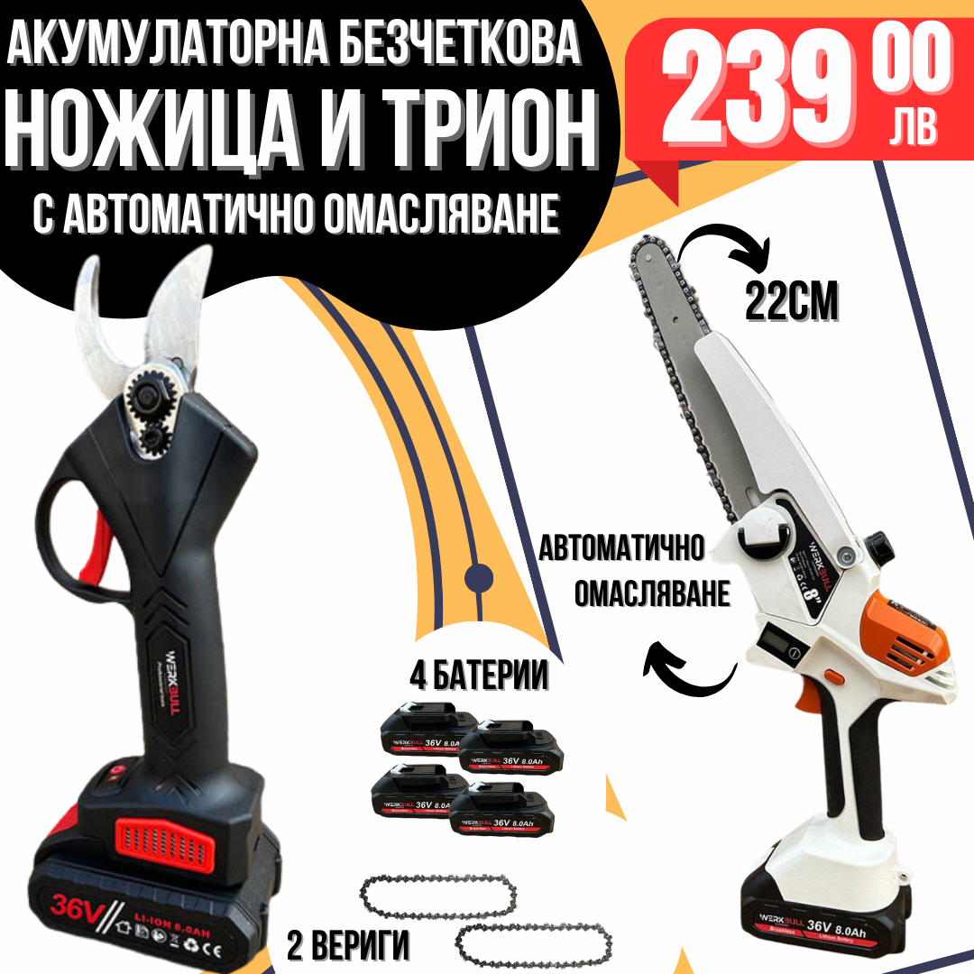Промо 2в1 комплект WerkBull Акумулаторна Лозарска ножица и Мини Трион с омасляване