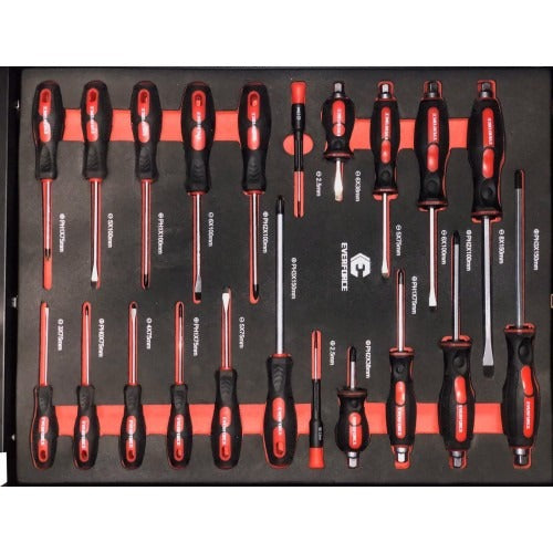 -Комплект кръстати и плоски отвертки: PH 3x150 MM, 8x150 MM, PH 2X100 MM, 6x100 MM, PH 1x75 MM, 5x 75 MM, PH 2x38 MM, 6x38 MM, 2.5 MM, 2.5MM, PH 3x150 MM, PH 2x100 MM, 5x75 MM, 6x100 MM, PH 1x75 MM, PH 1x100 MM, 4x75 MM, 5x100 MM, PH 0x75 MM, PH 1x75 MM, 3x75 MM
