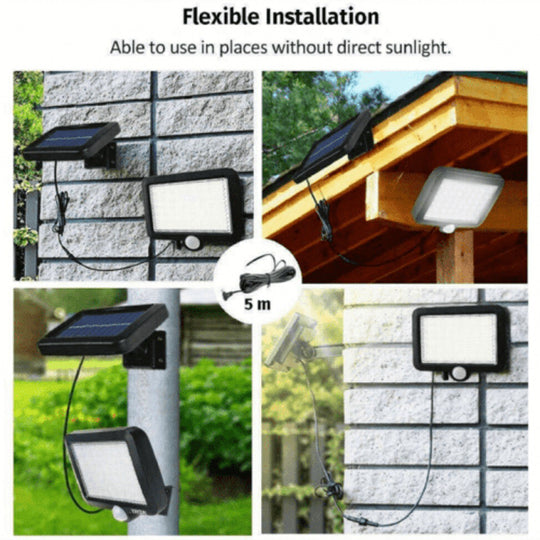 Мощна соларна LED лампа със 120 COB диода и сензор за движение. С отделен соларен панел и кабел 5 метра. С отделния соларен панел и кабел, тази лампа е изключително подходяща за монтиране на места където няма пряка слънчева светлина. Самата лампа може да се използва и в закрити не осветени помещения. Подходяща за монтиране под козирка.