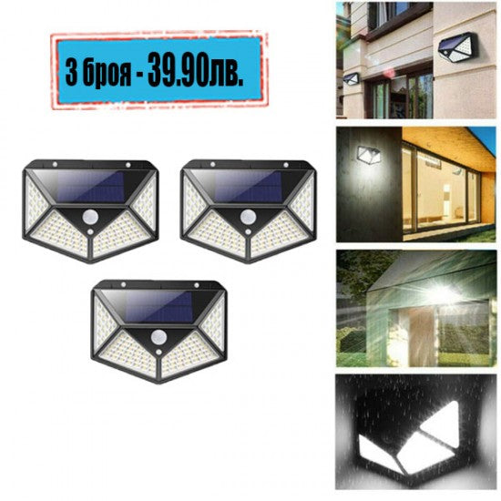 Тези лампи са енергоспестяващи и са с интелигентна система за външно осветление. Компактни, влагозащитени, подходящи са за външен монтаж за осветление на: паркове,градини, вили, къщи, дворове, навсякъде където има нужда от автономно осветление. 100 LED светлини осигуряват супер ярка светлина с максимум 1200 лумена. Лампите имат 3 режима на осветление.