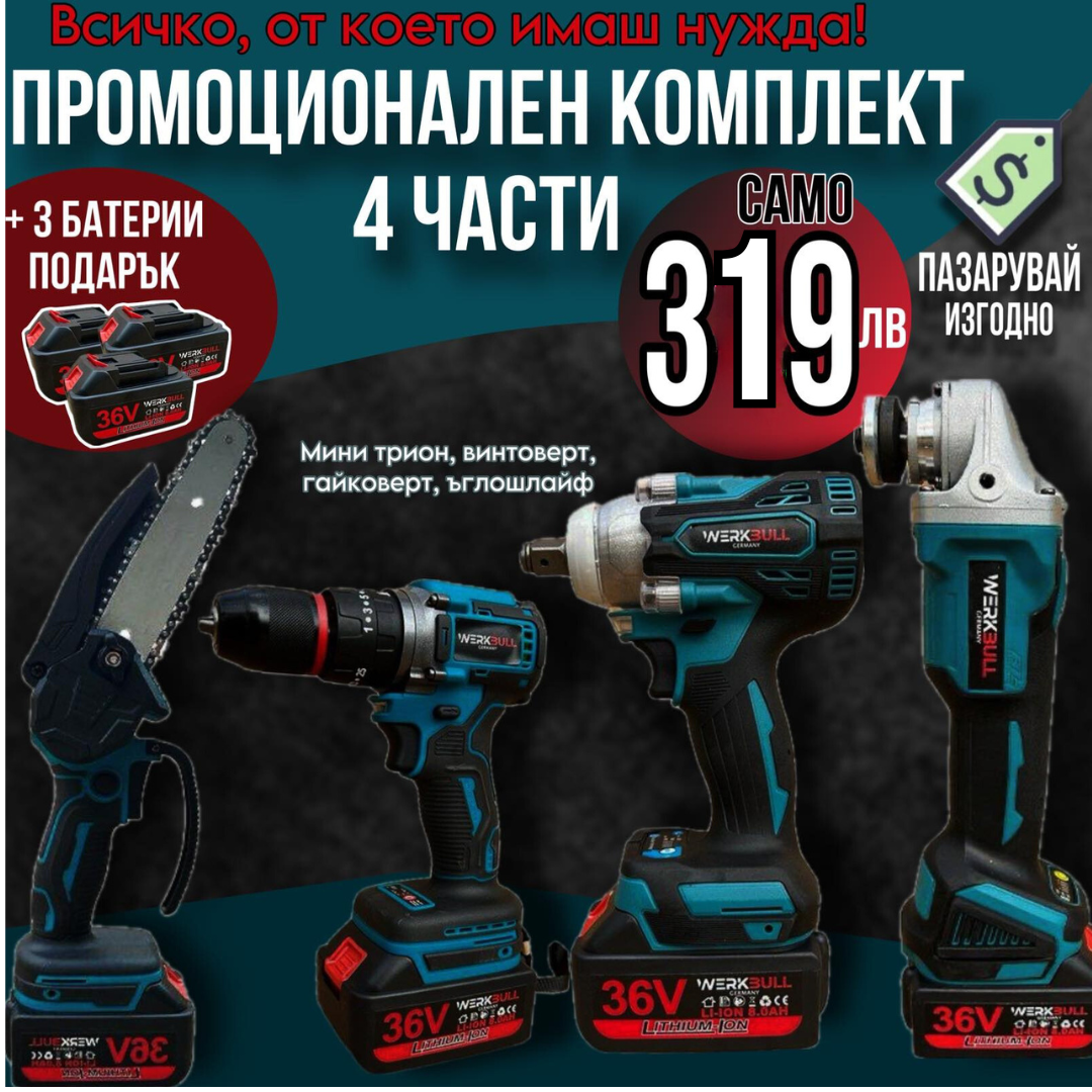 4в1 Комплект - Акумулаторен трион 16 см шина, Ъглошлайф 125ММ, Гайковерт и Винтоверт 36V с 3 бр. батерии 8AH в куфар и зарядно