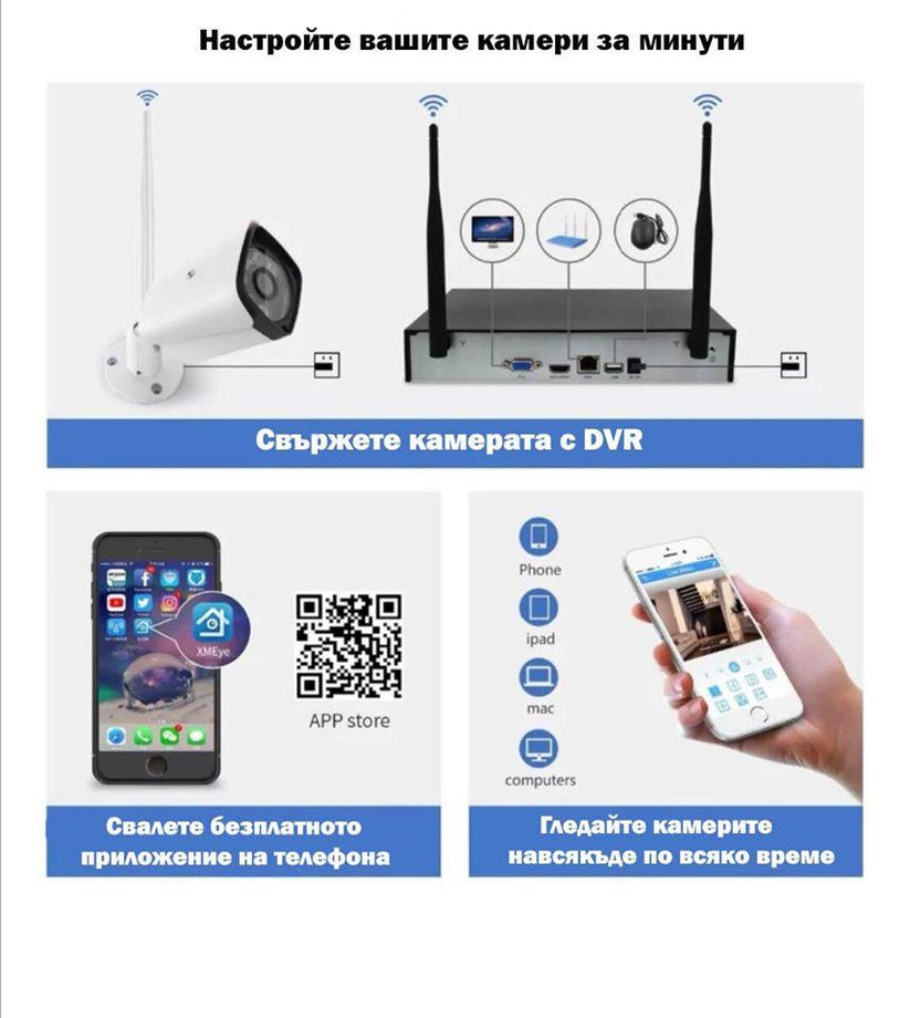 Камерите са оборудвани с NVR ONVIF IP технология, която ви позволява достъп и гледане в реално време чрез смартфон, таблет или компютър в режим стрийминг. Работи с всички операционни системи, които са в момента на пазара - Apple, Android, Windows, Symbian и др. Камерите са подходящи за външен и вътрешен монтаж.