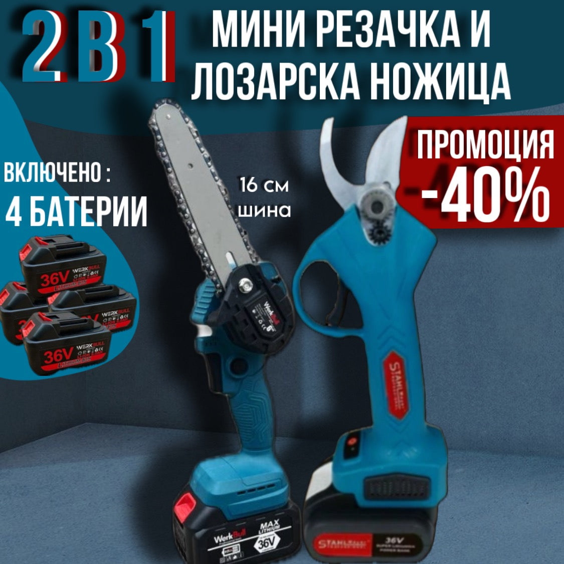 Промо 2в1 комплект WerkBull Акумулаторна Лозарска ножица и Мини Трион + 4 батерии